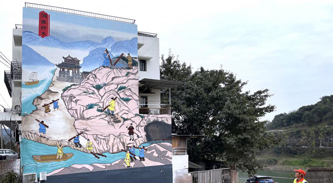 2月18日,上游新闻记者根据网友提供的线索来到木洞镇,寻访这些画在场镇外墙上的“美丽乡村新图景”。刚刚进入木洞镇,两幅巨大的彩绘画面就一下子吸引了记者的注意力:一幅是反映木洞镇得名的传说“洞出神木”,画面生动地描绘出明代在此建禹王庙,所需木材从镇子西面的石洞中取出,而得名“木洞”;另一幅则是画的“木洞十二景”之一“芭蕉夜雨”,反映苏家浩芭蕉屋基当年马帮商贸往来,在此打尖歇脚的兴旺景象。画面上的土屋拱桥和画面外新木洞镇的大桥、民居相映成趣,让游客产生一种穿越古今的魔幻感觉。