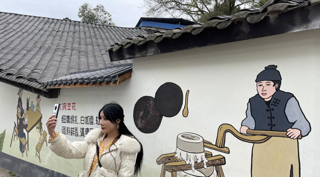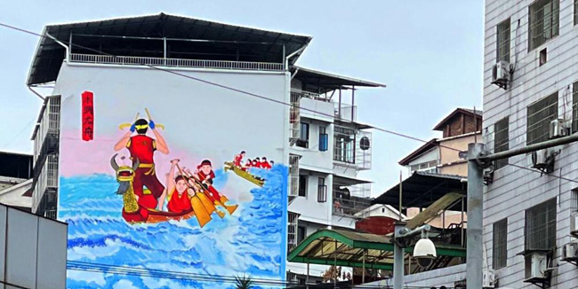 上游新闻记者在木洞场镇还看到:反映木洞美食的木洞豆花、蜜枣、榨菜、油酥鸭等彩绘;以及描绘木洞山歌、木洞龙舟等非遗项目的彩绘,全方位展现了木洞古镇的人文、美景、美食。
