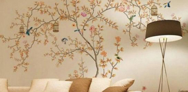 首先来看这幅!在很多时候,家居生活总想多一点浪漫的气息,赶走单调的味道,这幅简约墙绘就能够帮到你!这幅简约墙绘的底色用的是暗黄色,图案是选用了一棵开满玫瑰的玫瑰树,玫瑰的花语就是浪漫,会营造出一种浪漫的气氛!