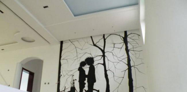 其次来看这幅!这幅简约墙绘图案的手法算是写意画的范畴了,我们在看多了那些山水墙绘,偶尔换换风格也会觉得特别舒服!这幅简约墙绘的图案是一对情侣在树下温存,是不是很不简单呢?